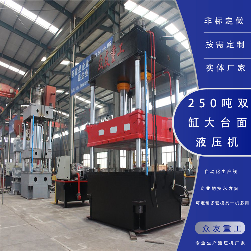 250噸雙缸大臺面四柱油壓機產品特點:三梁四柱結構,經濟實用,液壓控制采用插裝閥集成系統,減少泄露點,動作可靠,使用壽命長,可實現定壓和定程兩種成形工藝,具備保壓延時
