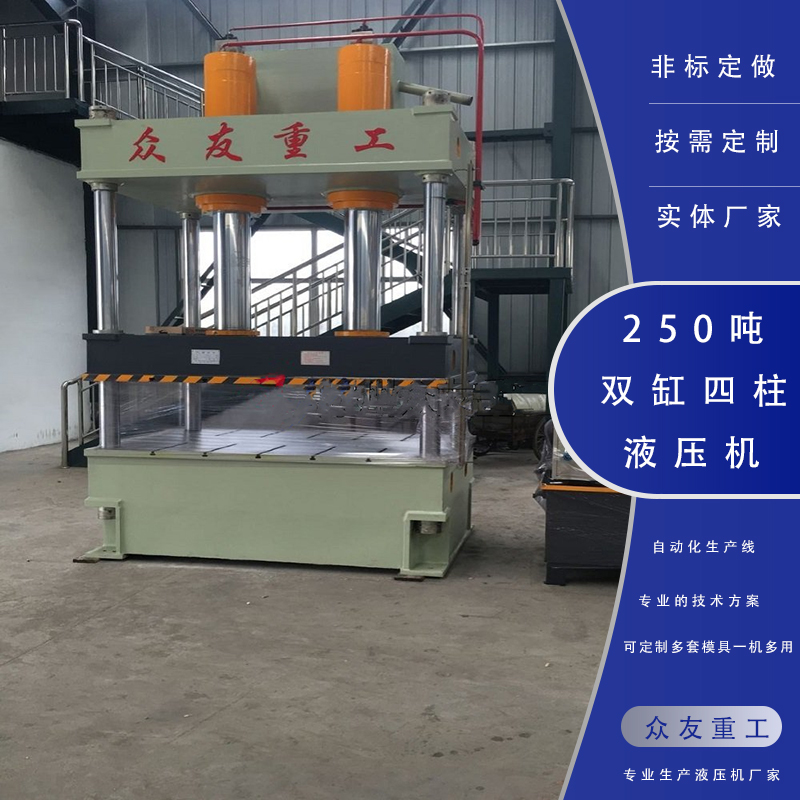 250噸雙缸四柱油壓機產(chǎn)品特點:三梁四柱結(jié)構(gòu),經(jīng)濟實用,液壓控制采用插裝閥集成系統(tǒng),減少泄露點,動作可靠,使用壽命長,可實現(xiàn)定壓和定程兩種成形工藝,具備保壓延時功能,