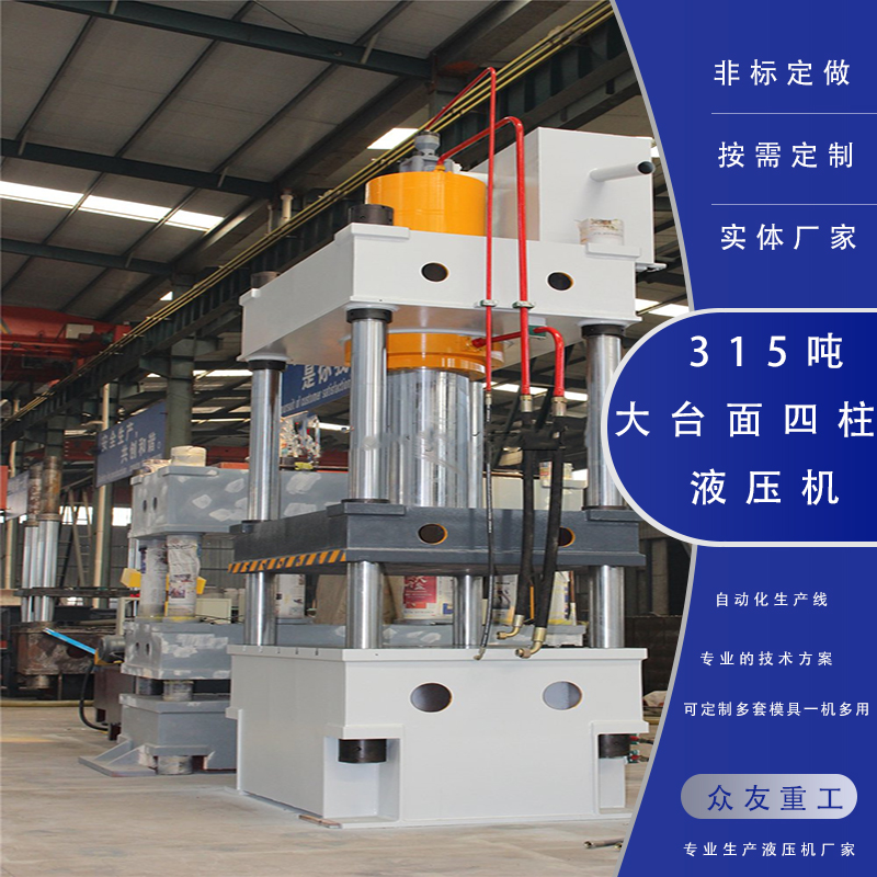 315噸大臺面四柱油壓機產品特點:三梁四柱結構,經濟實用,液壓控制采用插裝閥集成系統,減少泄露點,動作可靠,使用壽命長,可實現定壓和定程兩種成形工藝,具備保壓延時功能