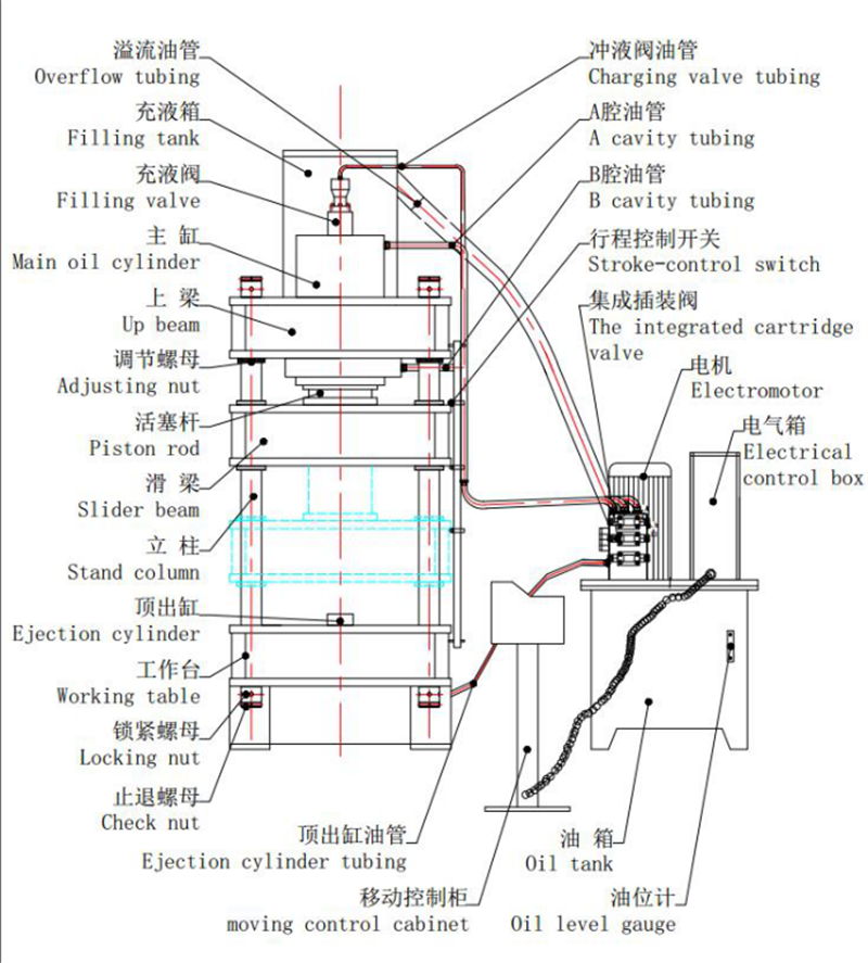 主機(jī),機(jī)身采用三梁四柱式結(jié)構(gòu):它由上、下橫梁、滑塊、工作臺(tái)、立柱、主缸、液壓動(dòng)力系統(tǒng)及電器系統(tǒng)等部件組成