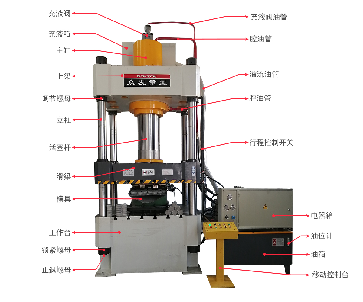 產品詳情 1、機身 主機,機身采用框架式結構:它由上橫梁、滑塊、工作臺、立柱、主缸、液壓動力系統及電器系統等部件組成。 2、主缸 主缸缸體固定于臺面。活塞下端用聯結法蘭、