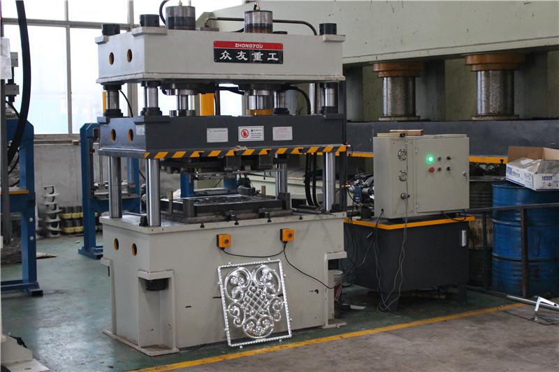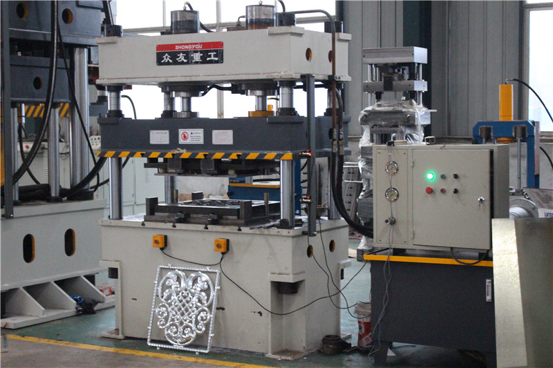 100噸壓花切花三梁四柱油壓機是山東滕州眾友重工機械設備有限公司自主研發生產設計的,設備由主機及控制機構兩大部分組成,通過管路及電氣裝置聯系起來構成整體。主機部分包括機身、主缸、限程裝置等。控制機構包括液壓泵站(動力系統)、電器箱、移動操縱臺等組成